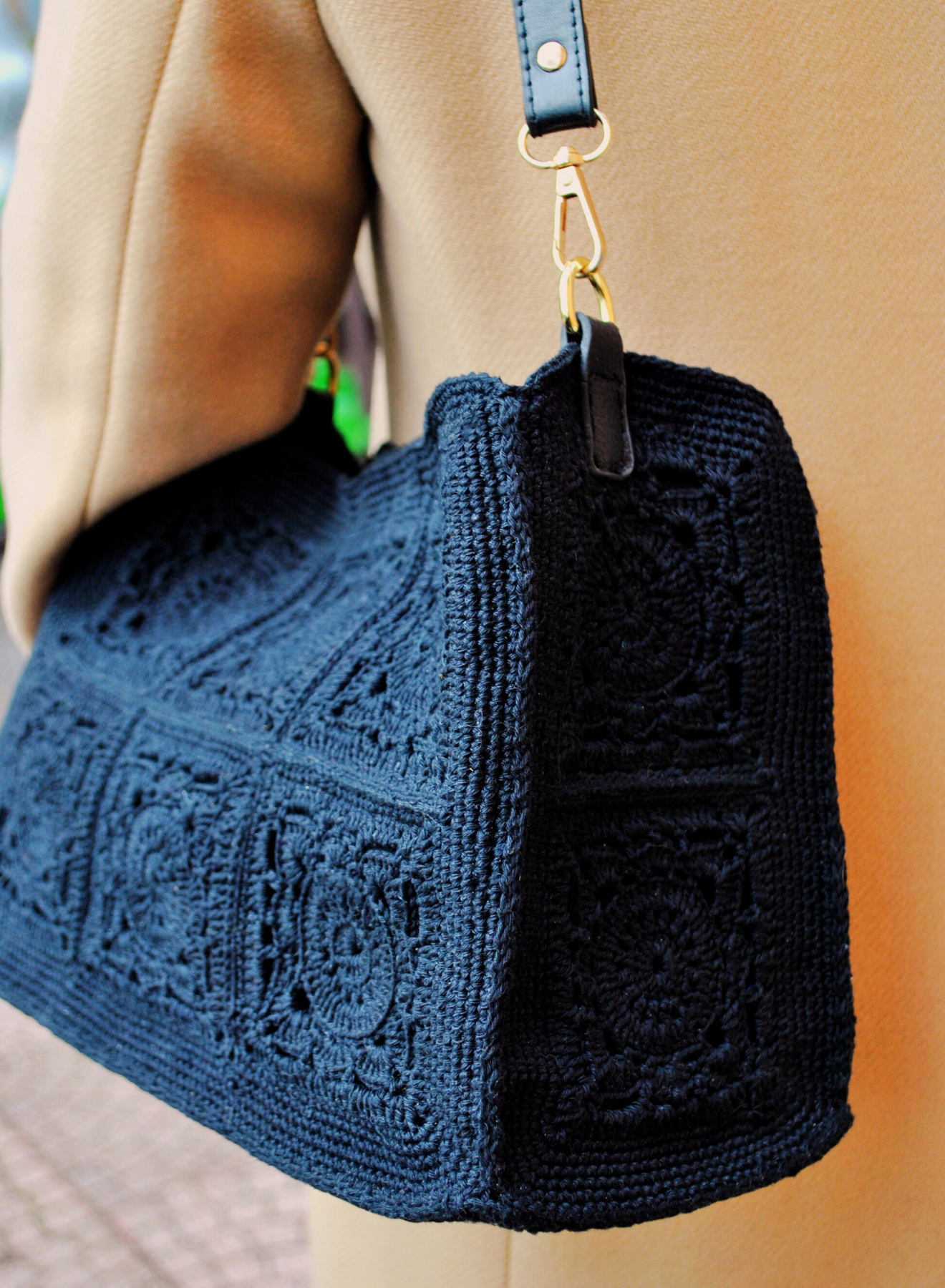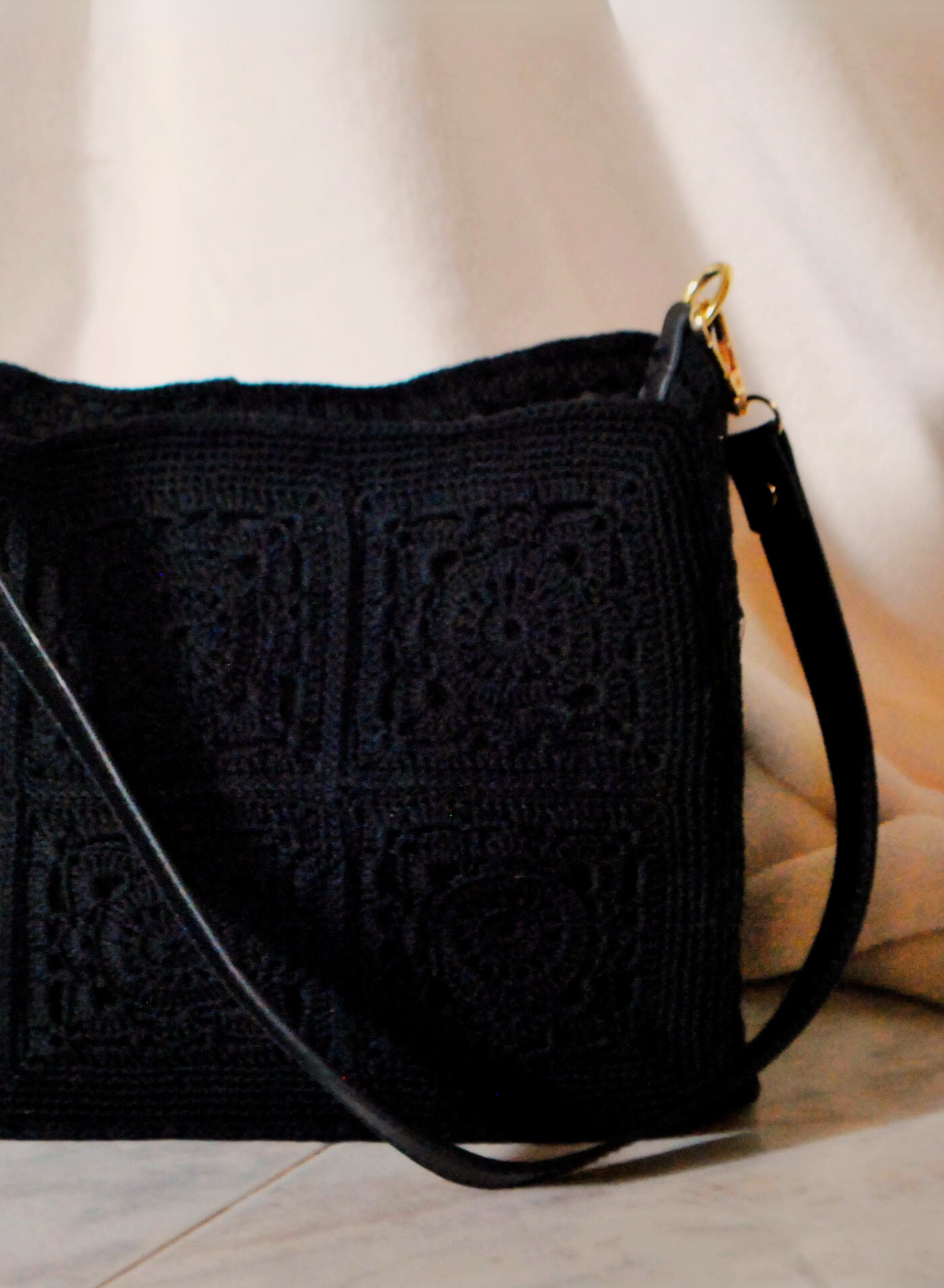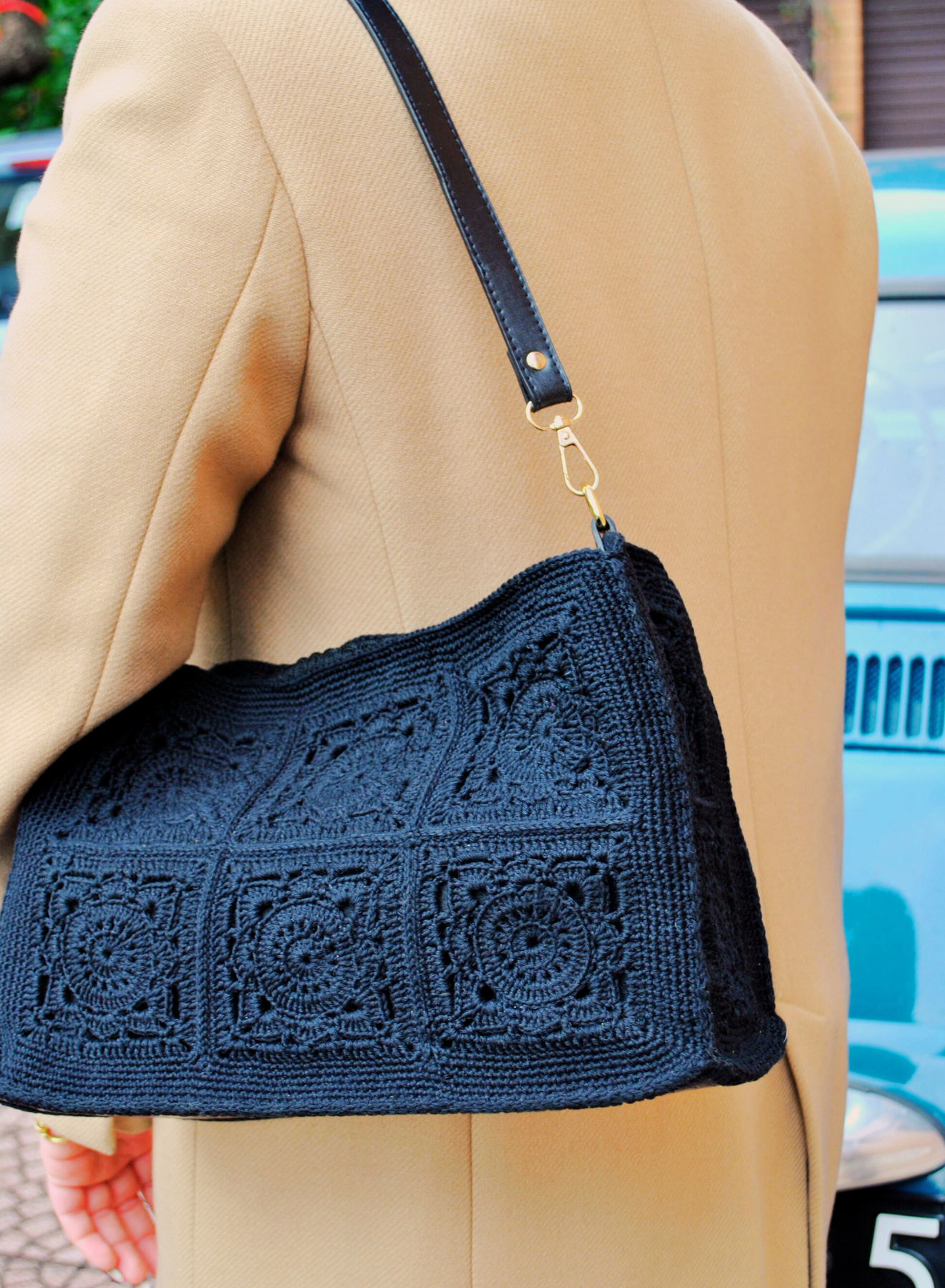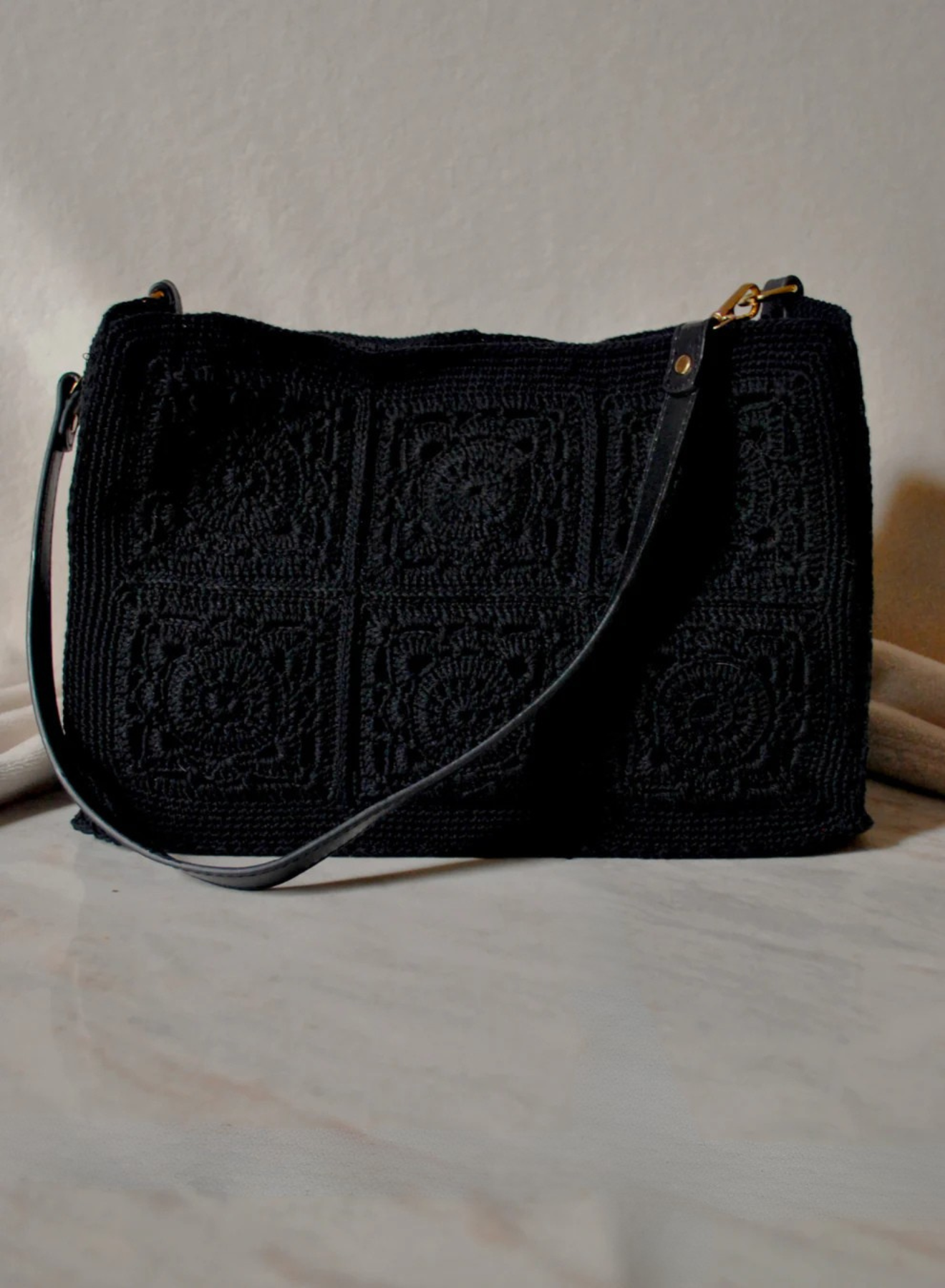 Un’elegante fusione di tradizione e modernità, questa borsa a spalla in cotone nero realizzata all’uncinetto con la tecnica granny incarna uno stile intramontabile che richiama il fascino retrò, reinterpretato con un tocco contemporaneo. Le rifiniture dorate e la tracolla in tinta nera aggiungono un accento moderno e sofisticato, rendendola l’accessorio perfetto per ogni occasione, dal giorno alla sera.