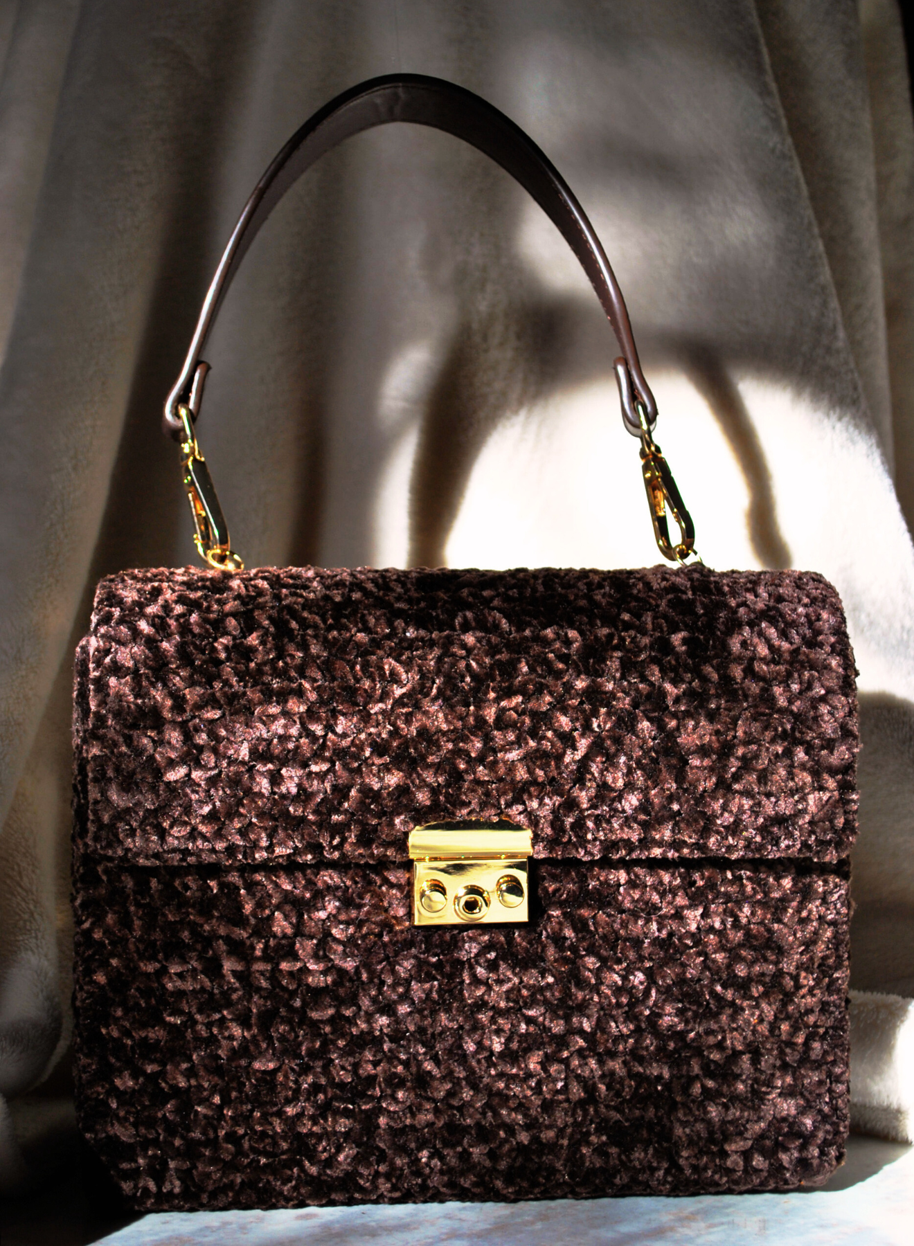 Il pratico manico ne facilità l'uso, trasformandola in un accessorio versatile adatto sia per un'occasione speciale che per arricchire un look casual con un tocco di eleganza artigianale. La trama all'uncinetto, curata nei minimi dettagli, esalta la bellezza del vellutino, conferendo alla borsa un carattere esclusivo e senza tempo.
