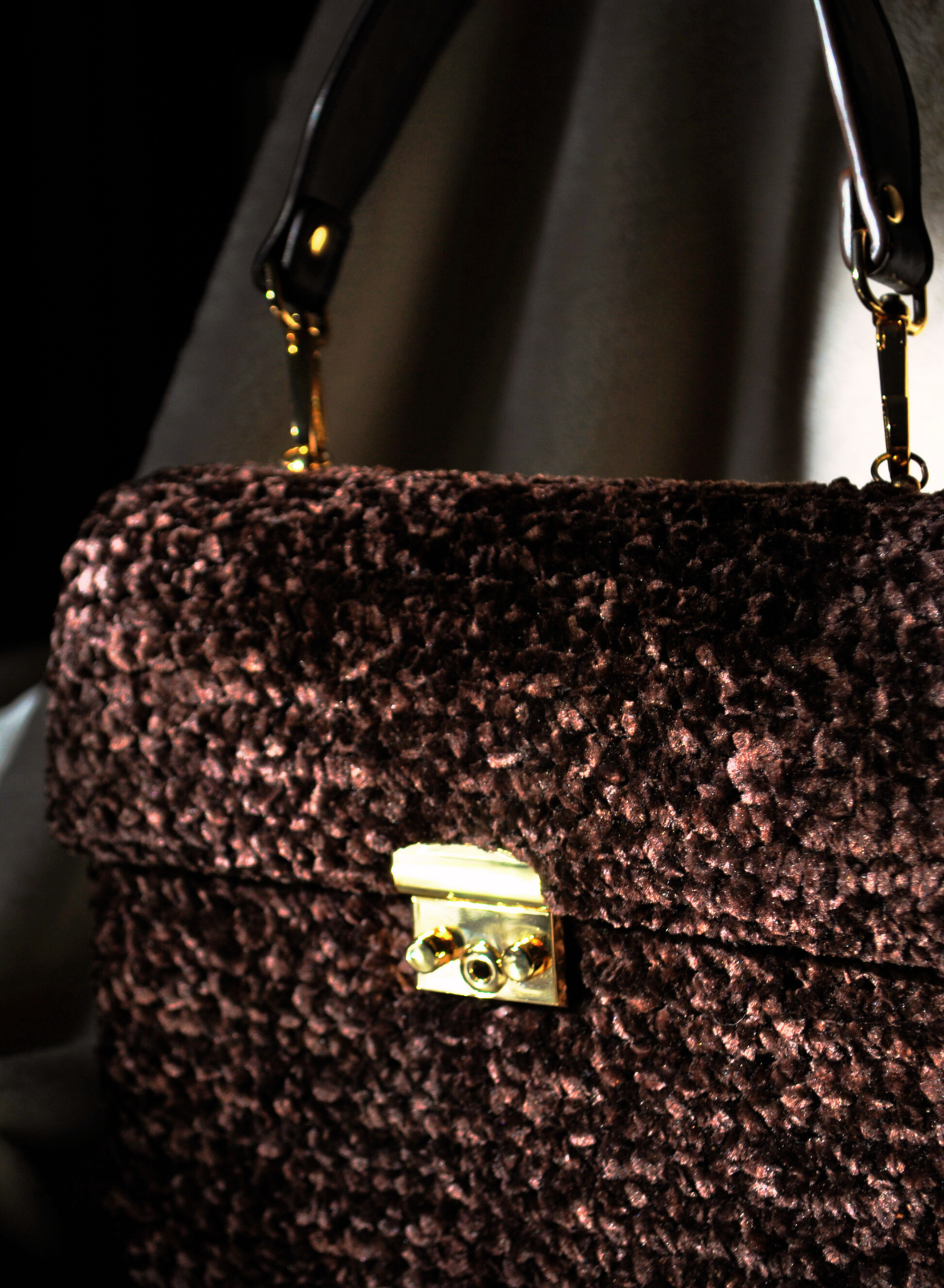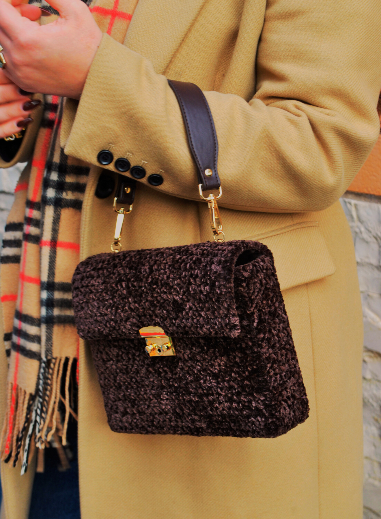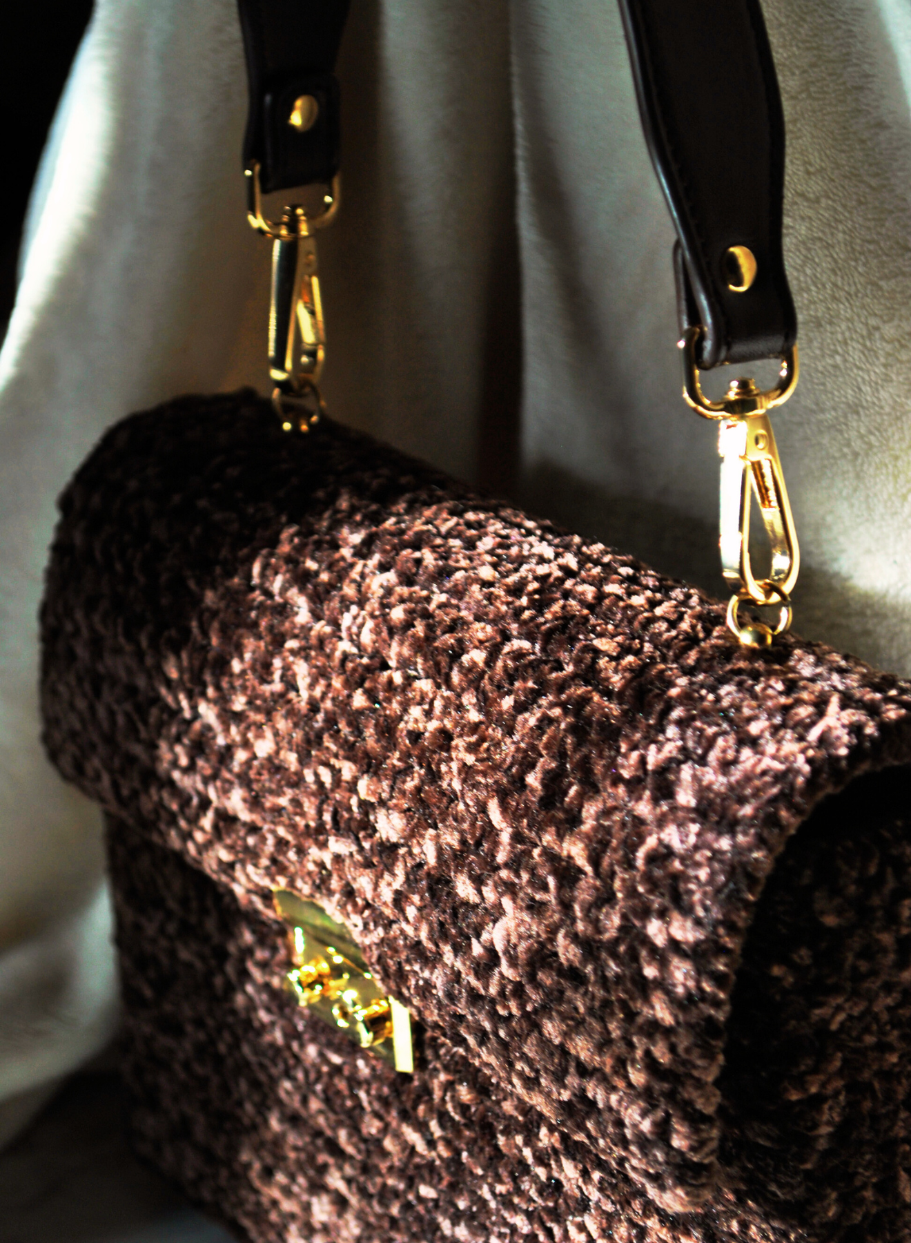 TINA è un accessorio elegante, unico e artigianale, interamente realizzata all'uncinetto con vellutino testa di moro, un materiale morbido e raffinato al tatto. Le dimensioni compatte non la rendono meno perfetta per custodire gli oggetti essenziali con stile.